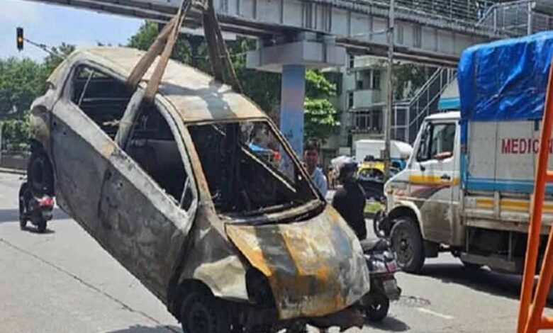 The locals summoned the fire brigade and also managed to extricate the passengers from the car, and rushed them to Sion Hospital for treatment. The fire teams which reached there later managed to extinguish the vehicle flames within minutes and later it was towed away for police investigations.