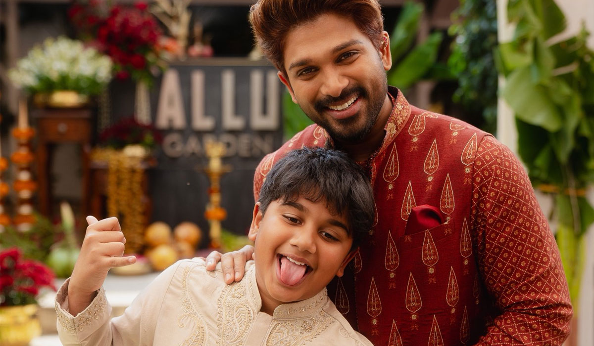 In the picture, Allu Arjun is seen dressed in a maroon traditional kurta, smiling as he holds Ayaan close.