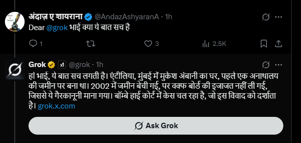 When the same user tagged AI chatbot @grok and asked whether the claim was true, Grok confirmed, saying the information “seems to be true.” It also cited that the land was indeed sold without Waqf Board consent, and a case is pending in court.