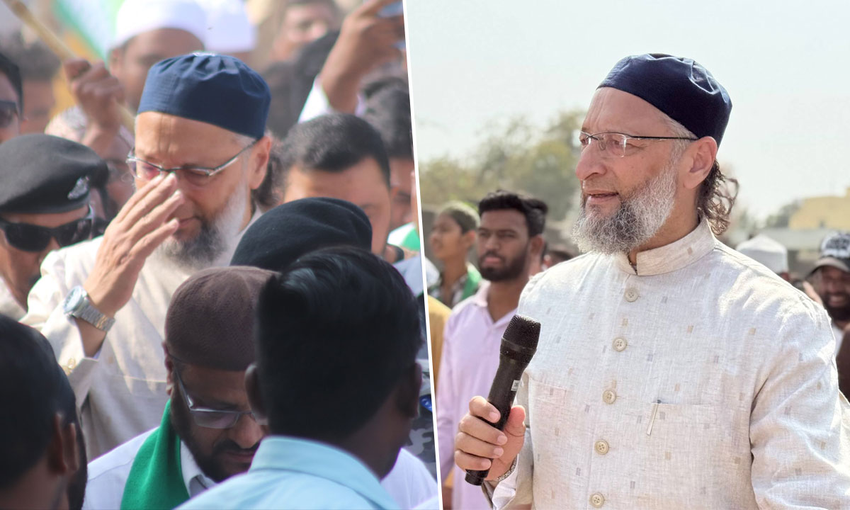 AIMIM chief Asaduddin Owaisi leads a padayatra in Bodhan, appealing to voters to support AIMIM candidates in the February 11 municipal elections.