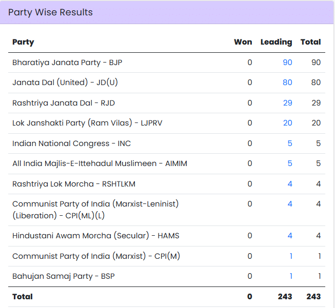 Bihar Assembly Results, Party Wise: