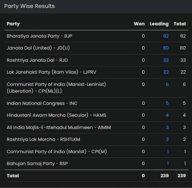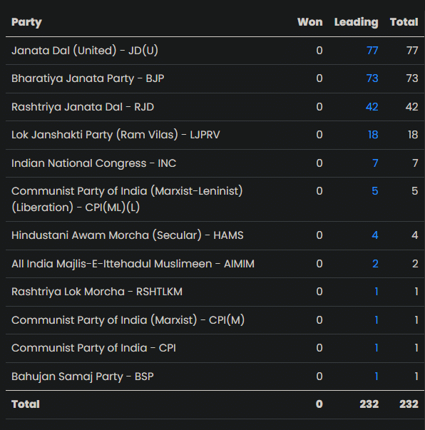 NDA allies JD(U) and BJP go neck-and-neck, Chirag Paswan-led LJP (RV) emerges as the dark horse.
