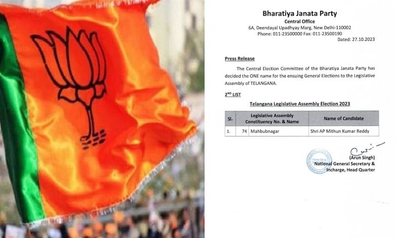 In a press release on Friday, BJP National General Secretary & Incharge of Headquarters, Arun Singh, stated that the Central Election Committee of the Bharatiya Janata Party, under the leadership of party National President Jagat Prakash Nadda, has named AP Mithun Kumar Reddy as the candidate who will be contesting from Mahbubnagar (74).