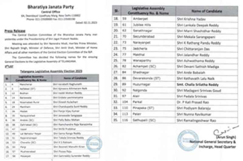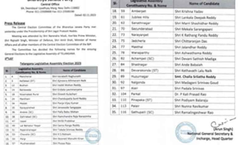The party said, “The Central Election Committee of the Bharatiya Janata Party has decided the names for the ensuing General Elections to the Legislative Assembly of Telangana.”