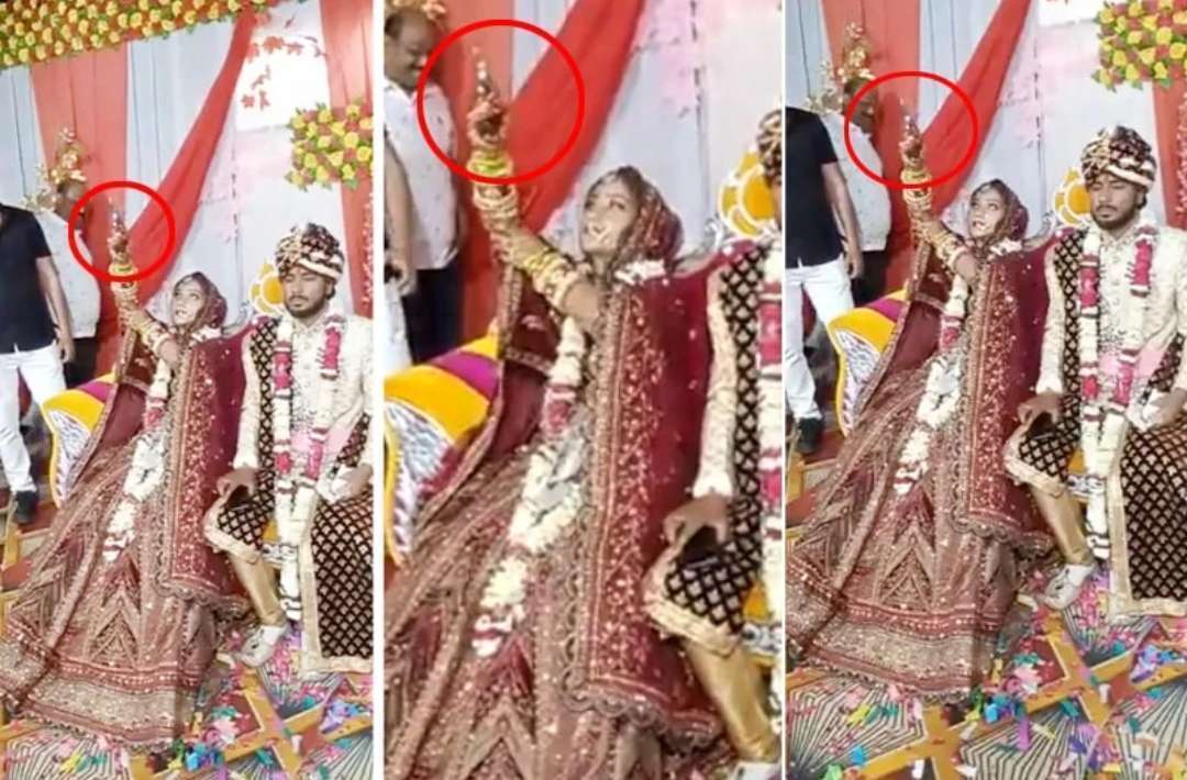 The video is said to be from Hathras, Uttar Pradesh, where the bride sitting on the stage suddenly fires a pistol in the air in front of the groom sitting next to her.