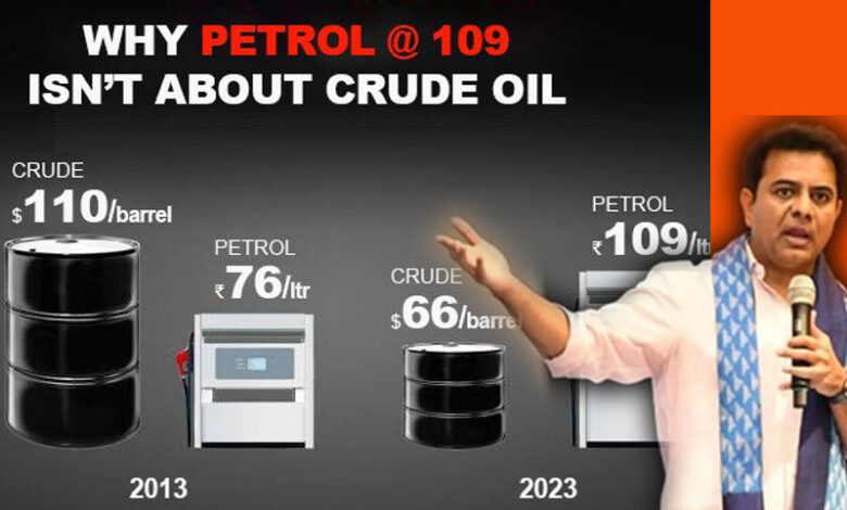 K T Rama Rao said that in May 2014 when crude per barrel was $107, petrol price was Rs 71 per litre but in March 2023 when crude oil per barrel is $65, the price of petrol is Rs 110 per litre.