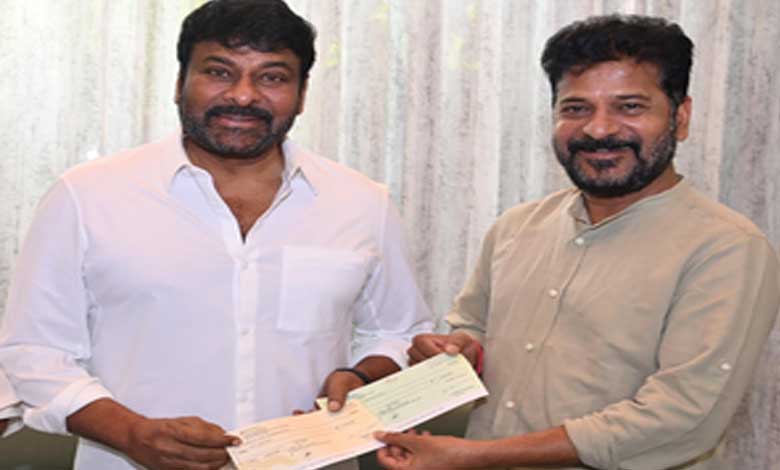 Chiranjeevi met Chief Minister A. Revanth Reddy at the latter’s residence in Jubilee Hills and presented the cheque.