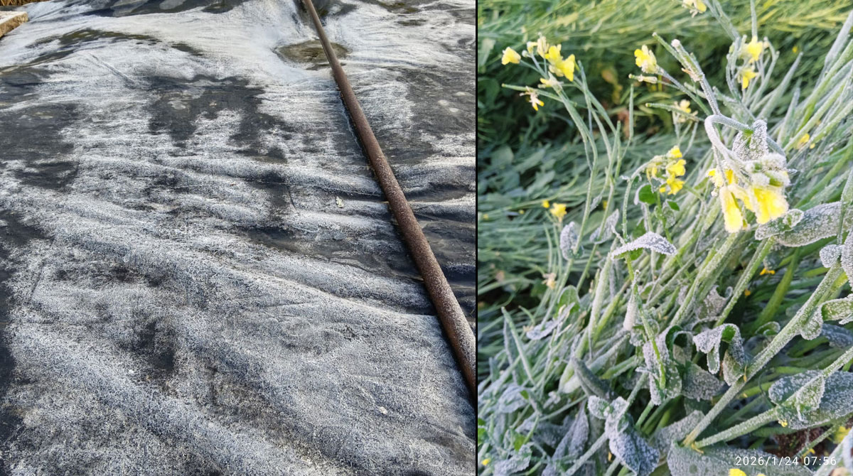 Lunkaransar in Bikaner recorded a minimum temperature of 0.3 degrees Celsius on Friday night, the lowest of the season so far. By Saturday morning, a thick layer of ice was visible in several areas of the state, while frost blanketed agricultural fields in districts such as Sikar, Barmer, Jaisalmer, and Shekhawati.