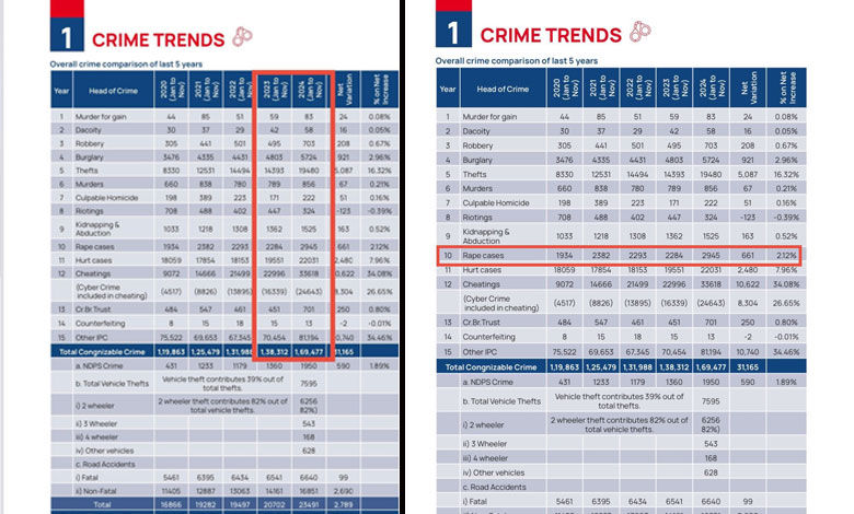 From January to November 2024, Telangana reported 1,69,477 cognizable crimes, up from 1,38,312 in 2023. The report highlighted an increase in violent crimes such as murders, rapes, robberies, and burglaries.