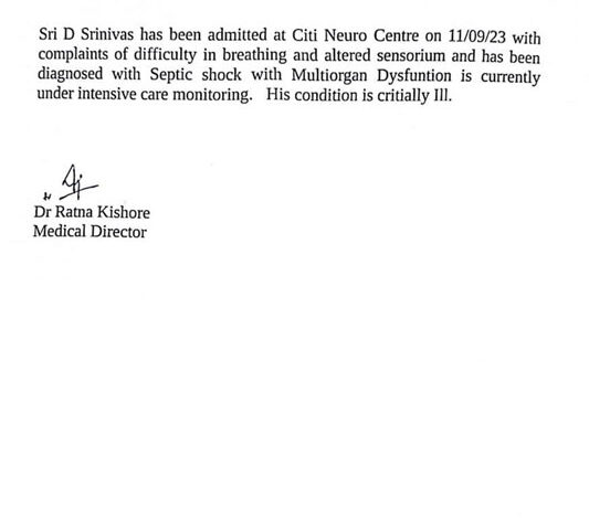 He have been admitted to the City Neuro Hospital. Meanwhile, the hospital administration has issued a medical bulletin regarding the health of D Srinivas, stating that several organs are not functioning, and his condition is currently critical. He is undergoing treatment in the ICU.
