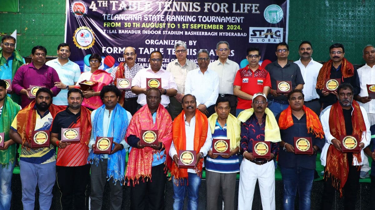 The 4th Table Tennis for Life Telangana State Ranking Tournament saw a heartwarming tribute to the sport’s pioneers at the L.B. Indoor Stadium today.