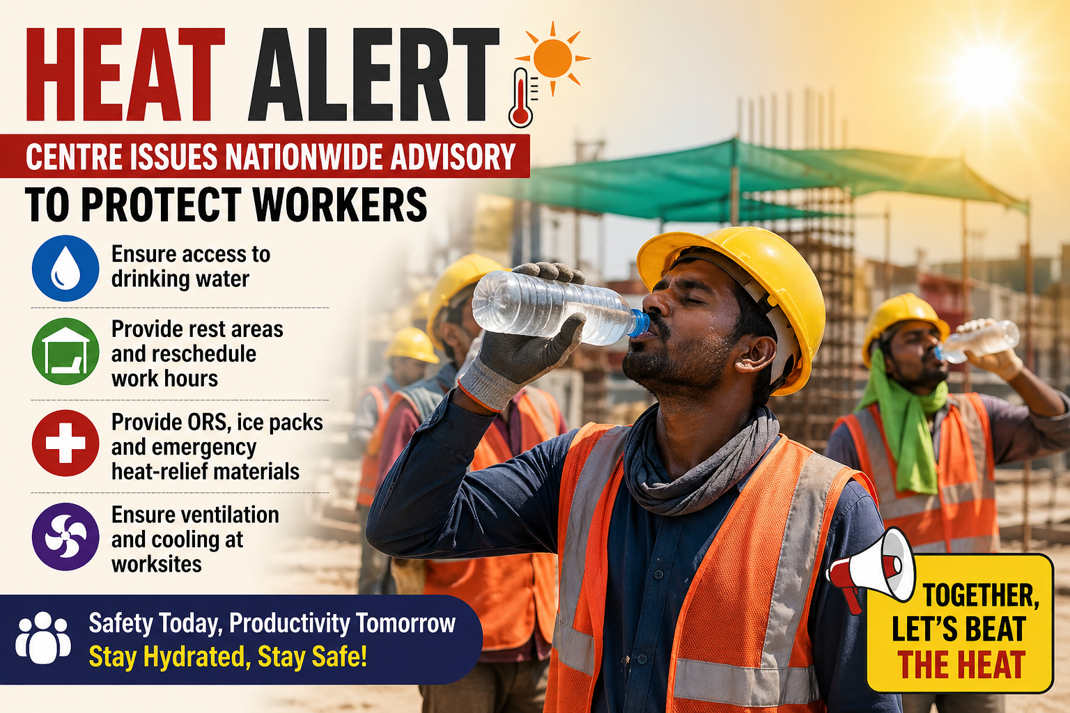 Centre issues nationwide heatwave advisory to protect workers; states asked to ensure water, rest areas, cooling and safety measures.