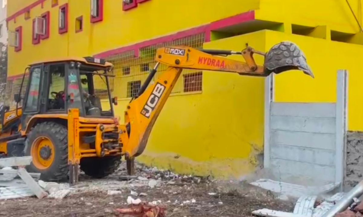 HYDRAA demolishes illegal structures on 1,600 square yards of encroached park land in Narsingi, Rangareddy district, reclaiming land worth up to ₹80 crore.