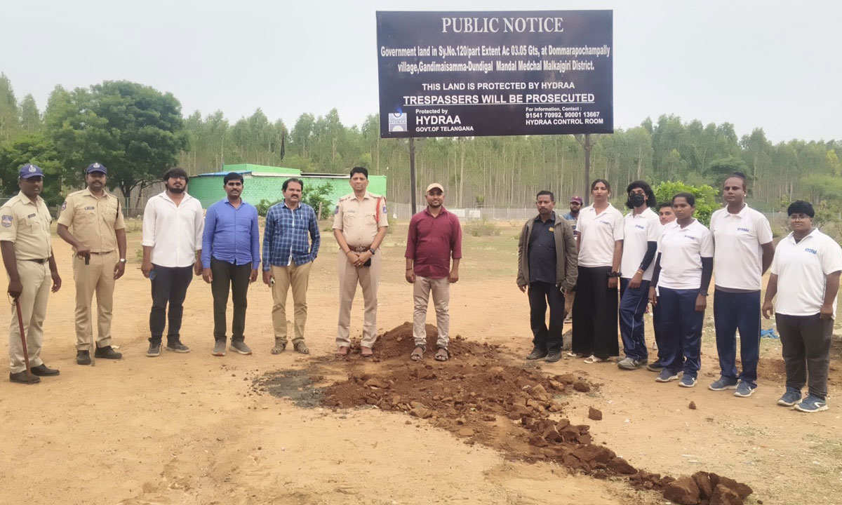 HYDRAA protected a 1600 square yards park land in Jubilee Hills behind the TV5 office and secured 4.20 acres of government land in Dundigal, Gandimaisamma Mandal. With fencing and official boards installed, the move follows complaints of possible encroachments and aims to prevent further illegal occupation of public property.