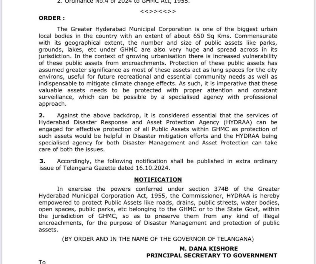 Hyderabad: On October 16, the Telangana government expanded the powers of HYDRA (Hyderabad Disaster Response and Asset Protection Agency) under the GHMC Act. This move enables HYDRA to safeguard all public assets, including roads, drains, water bodies, parks, and more, owned by the Greater Hyderabad Municipal Corporation (GHMC) or the state government.