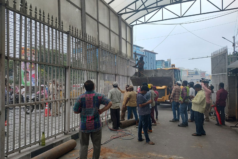 Officials with the help of scores of municipal workers and by deploying two bulldozers and gas cutters started demolishing the iron structure which had come up during the term of former Chief Minister K. Chandrasekhar Rao.