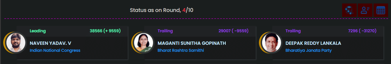 At the end of four rounds, Congress candidate Naveen Yadav was leading by 9,100 votes.
