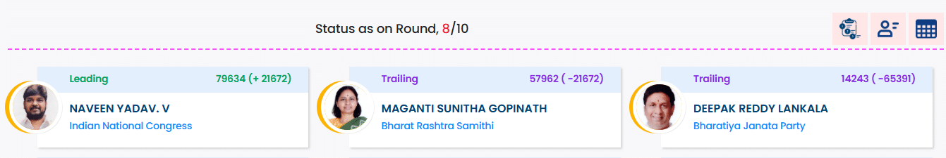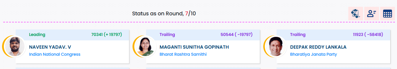 After six out of 10 rounds of counting, Congress candidate Naveen Yadav improved his lead to over 19,000 votes against his nearest rival, Maganti Sunitha of Bharat Rashtra Samithi (BRS).