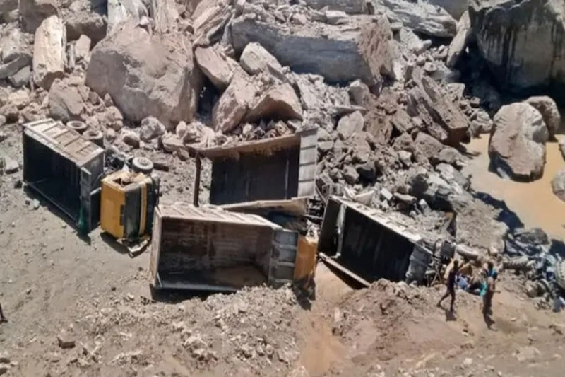 The hill collapsed while miners were working inside the cave. As a result, big boulders of white stone rolled down the hill and collided with the tipper trucks and vehicles, causing them to overturn.
