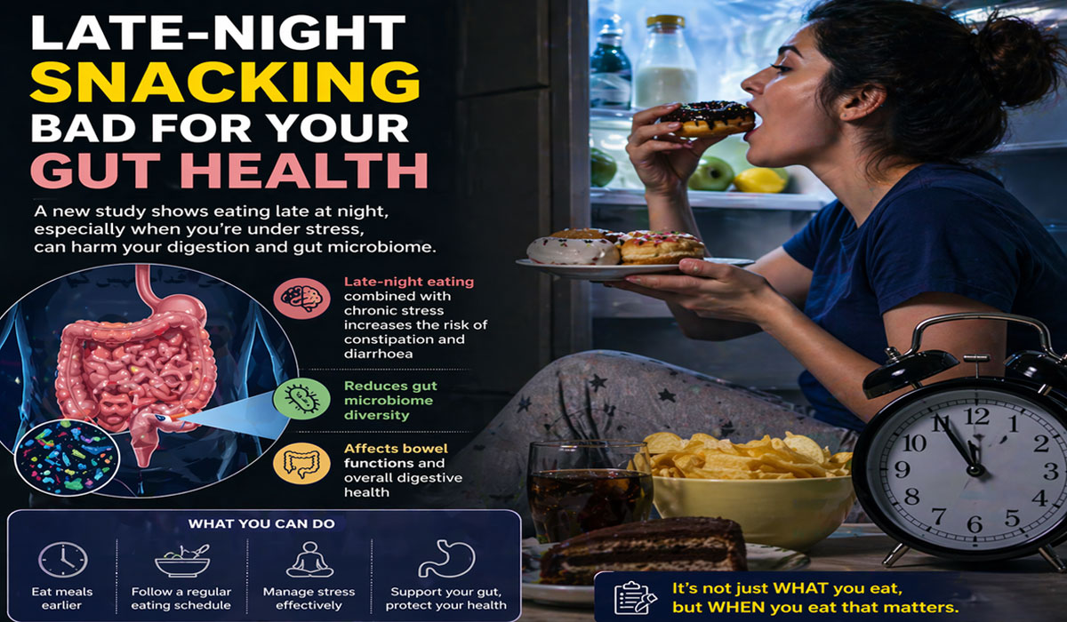 Individuals with a high allostatic load score — the cumulative physiological stress as reflected in body mass index (BMI), cholesterol level, and blood pressure — who also reported eating more than 25 per cent of daily calories after 9 p.m. were 1.7 times more likely to experience constipation and diarrhoea than those with lower scores who did not eat late at night.