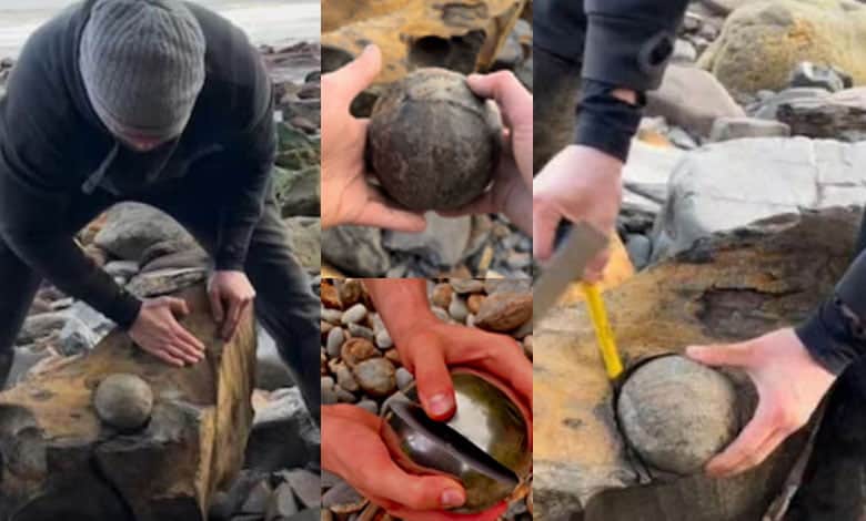 In a video that has captured widespread attention, a man was seen excavating along the seashore when he stumbled upon a mysterious round object embedded within the stones. Upon breaking it open, he revealed a hidden secret dating back approximately 180 million years, sparking intrigue and debate among viewers.