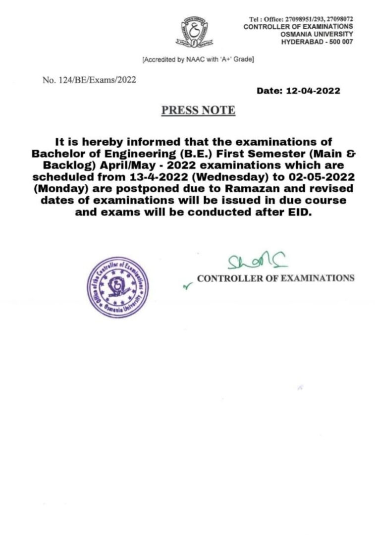 Issuing a statement OU declared, “The Examination Branch of Osmania University has detected that a Fake Circular with regards to BE I semester (Regular and Backlog) No 124/BE/Exams/2033 dated 12.04.2022 is circulating in social media.” Telangana Today reported.