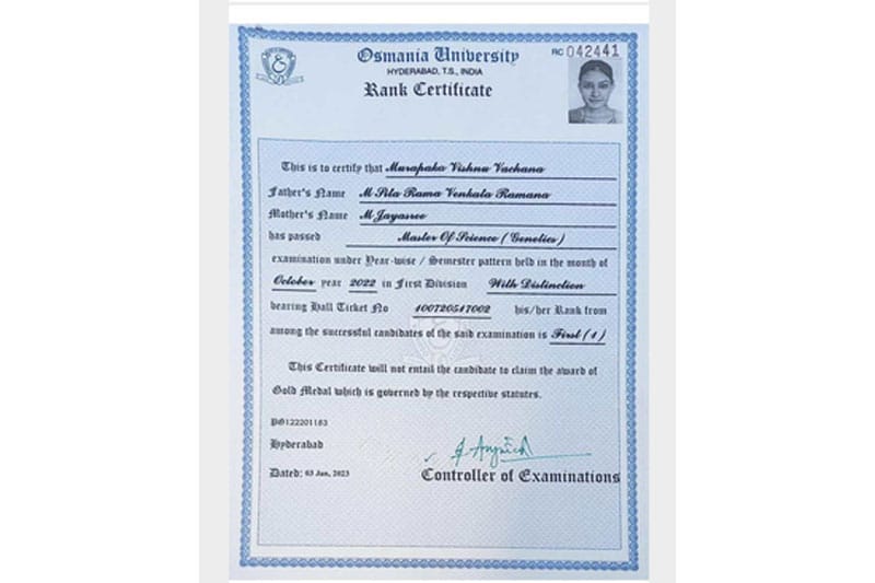 When Vishnu Vachana brought this to the notice of the Vice-Chancellor, Prof. D. Ravinder, and the Registrar, Prof. Pappula Laxminarayana, they told her that somebody had to donate money for the gold medal and no one has donated to the Department of Genetics and Biotechnology.