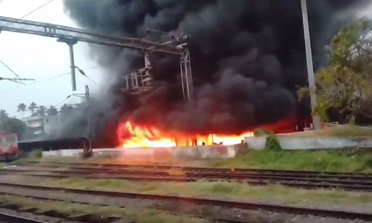 Thrissur: A major fire broke out at the Thrissur Railway Station on Sunday, destroying more than 200 two-wheelers parked at a designated parking facility adjacent to the station. The incident occurred at the two-wheeler parking area located near Platform No. 2, triggering panic among commuters and nearby residents. According to preliminary reports, the fire was first noticed around 6.45 a.m. Flames rapidly engulfed the parking area, which typically accommodates over 500 motorcycles and scooters on a daily basis.
