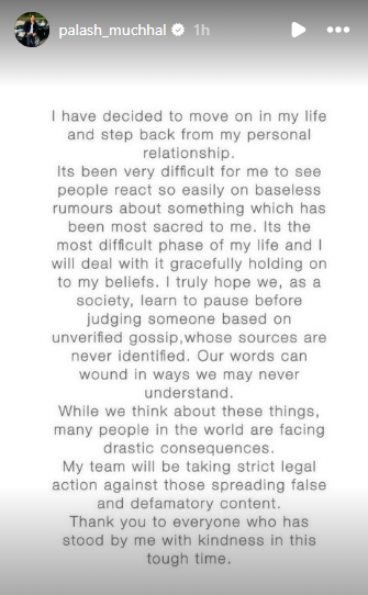 Shortly after her confirmation, Palash Muchhal issued his own statement, addressing the cheating allegations circulating online and making it clear that his team will pursue legal action against those spreading false information.