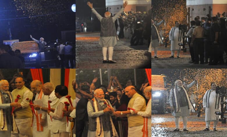 PM Modi arrives at BJP headquarters, accorded warm welcome