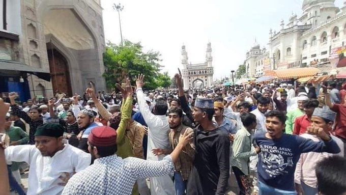 A massive protest was held outside the historic Mecca Masjid in the old city. Soon after Friday prayers, hundreds of people marched on the road towards Charminar, shouting slogans against suspended/sacked BJP spokespersons Nupur Sharma and Naveen Kumar Jindal.