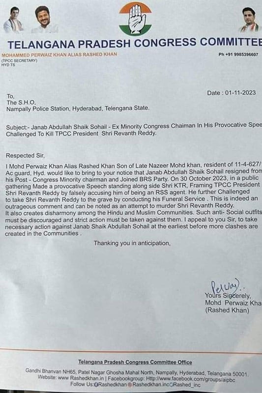 The complaint, filed by Congress leader Mohd Perwaiz Khan, also known as Rashed Khan, alleges that Sohail made a provocative speech on October 30, 2023, in the presence of Shri KTR, in which he falsely accused TPCC President Shri Revanth Reddy of being an RSS agent.