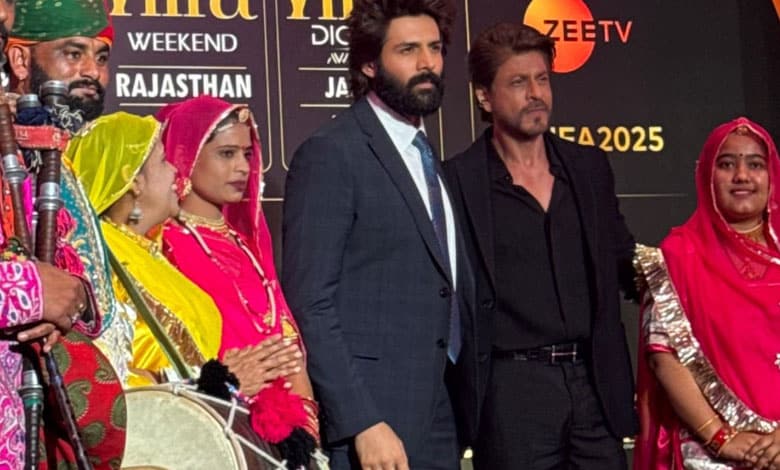 A viral video on social media shows SRK guiding Kartik on how to welcome film industry dignitaries, saying, “Padhaaro mhaare IIFA. Padhaaro mhaare des Rajasthan. Khamma ghani,” as both stars bow in respect.