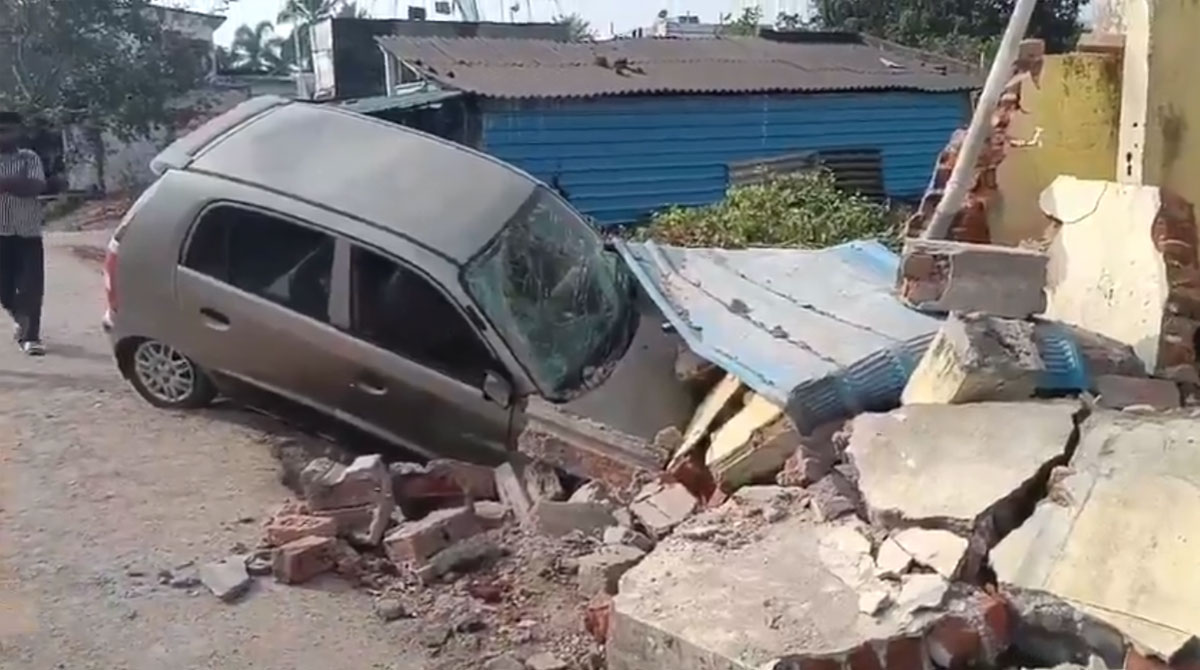 The impact was so severe that the compound wall of the house was completely damaged. A portion of the bathroom structure was also destroyed as the car ploughed into the building, causing panic among residents in the area.