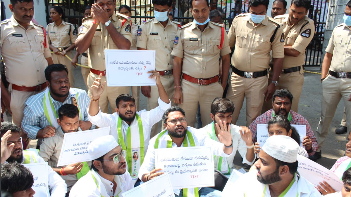 Hyderabad: Tension prevailed in Nampally on Friday after members of the Telangana Jagruti Students Federation staged a protest outside the office of the Telangana State Board of Intermediate Education (TSBIE), alleging that the board was supporting unauthorized colleges and jeopardizing students’ futures.