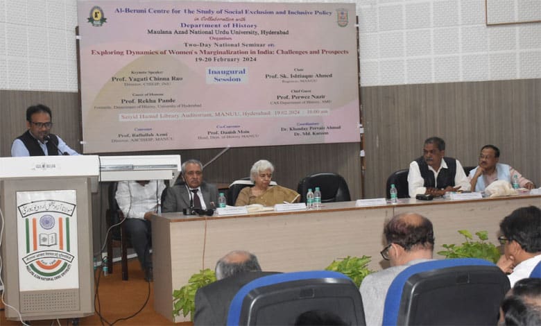 Hyderabad: “Studying women’s exclusion and discrimination is need of the hour. Women need support for their inclusion into mainstream development for any society’s growth” said Prof. Ishtiaque Ahmed, Registrar, Maulana Azad National Urdu University (MANUU) while delivering presidential remarks in the inaugural session of a Two-Day National Seminar “Exploring Dynamics of Women’s Marginalisation in India: Challenges and Prospects” organized by Al Beruni Centre for the Study of Social Exclusion and Inclusive Policy (ACSSEIP) in collaboration with the Department of History” on February 19 & 20, 2024.