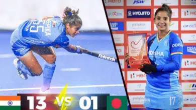 Mumtaz Khan slammed four goals while Kanika Siwach and Deepika slotted home a hat-trick as defending champions India routed Bangladesh…