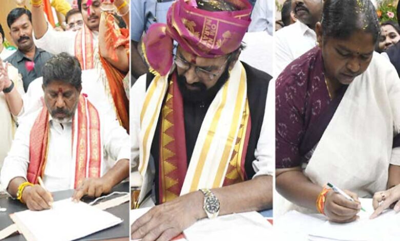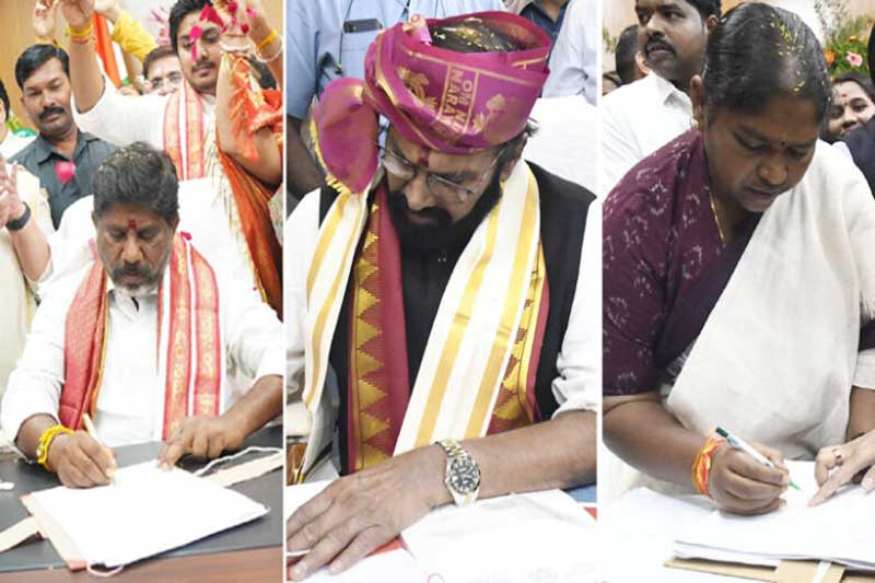 Nalamada Uttam Kumar Reddy took charge as minister for Irrigation & CAD, Food & Civil Supplies; C. Damodar Rajanarasimha took charge as minster for Health, Medical & Family Welfare, Science and Technology; Ponguleti Srinivas Reddy assumed office as the minister for Revenue and Housing and Information & Public Relations; and Seethakka took charge as the minister Panchayat Raj & Rural Development, Women & Child Welfare.