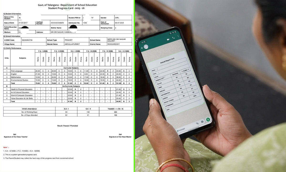 The Telangana government has delivered over 18 lakh school report cards through MeeSeva directly to parents’ WhatsApp numbers, covering Classes 5 to 9 in government schools. The paperless and secure system provides subject-wise marks and attendance, improving accessibility and strengthening digital governance across the state.