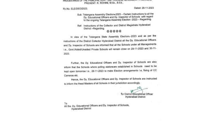 Regular educational activities are set to resume on December 1, 2023, following the conclusion of the election-related closures. The District Educational Officer of Hyderabad District extends gratitude for the cooperation and understanding of all educational stakeholders during this period.