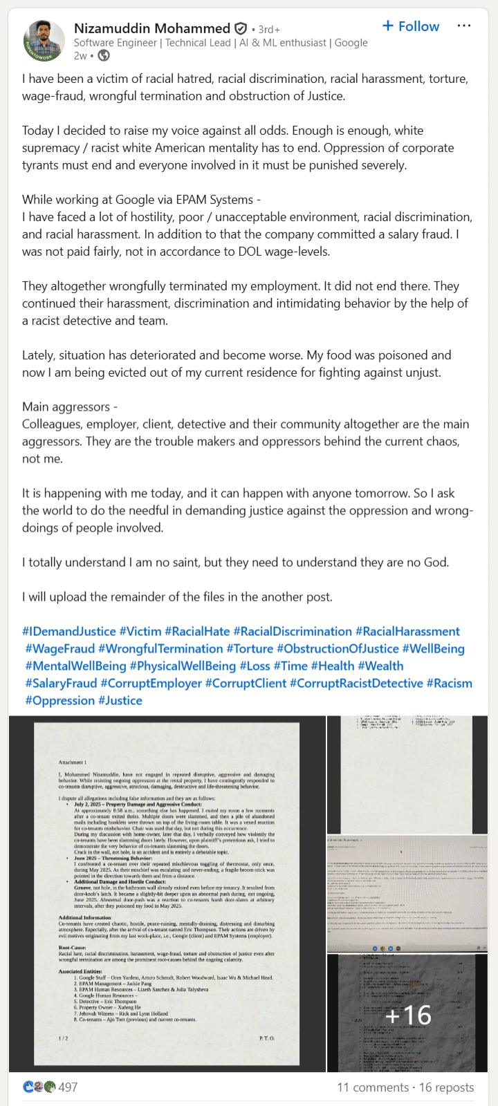 The family’s allegations are supported by public posts on Nizamuddin’s LinkedIn profile, where he detailed experiencing:
