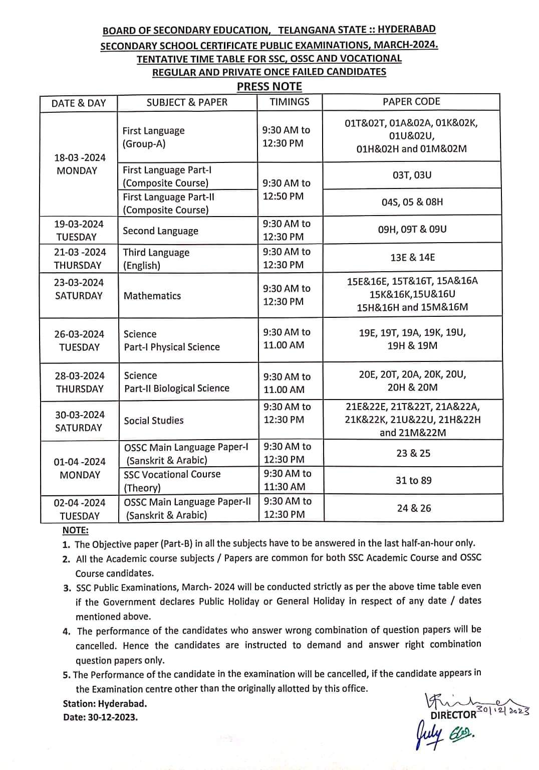 The Board of Secondary Education has announced the official exam schedule for SSC 10th grade in Hyderabad, Telangana. The director of the Secondary board announced that the exams will be held from March 18 to April 2. He mentioned that the exams will occur from 9:30 AM to 12:30 PM.