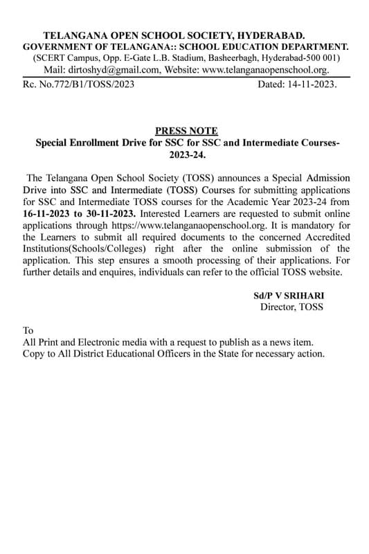 In an effort to facilitate education accessibility, the Telangana Open School Society (TOSS) has initiated a Special Enrollment Drive for SSC and Intermediate courses for the Academic Year 2023-24.