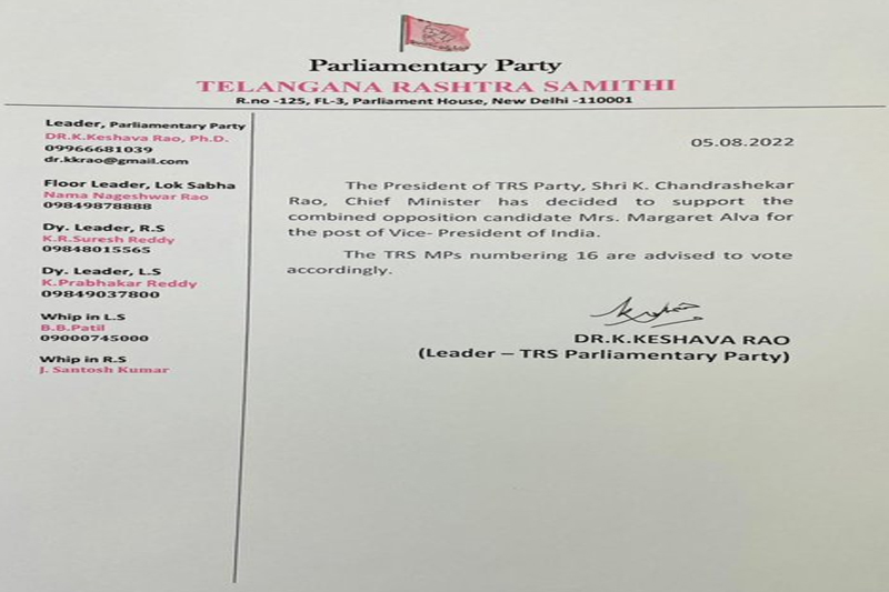 Announcing the party’s chief decision to extend support to the opposition candidate in the Vice President election , TRS Parliamentary Party leader Dr K.Keshava Rao advised the party MPs numbering 16 to vote accordingly.