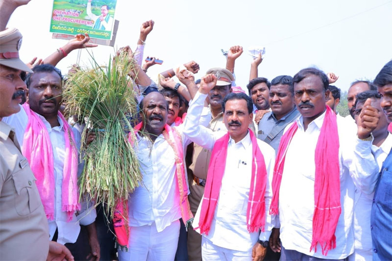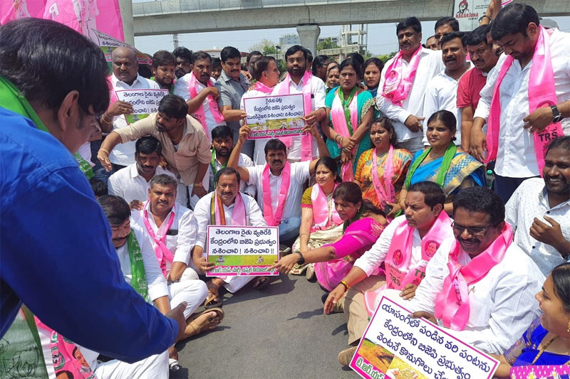 Ministers, state legislators, other public representatives led the protest, demanding the Centre to procure entire paddy from Telangana during the ongoing Rabi season.
