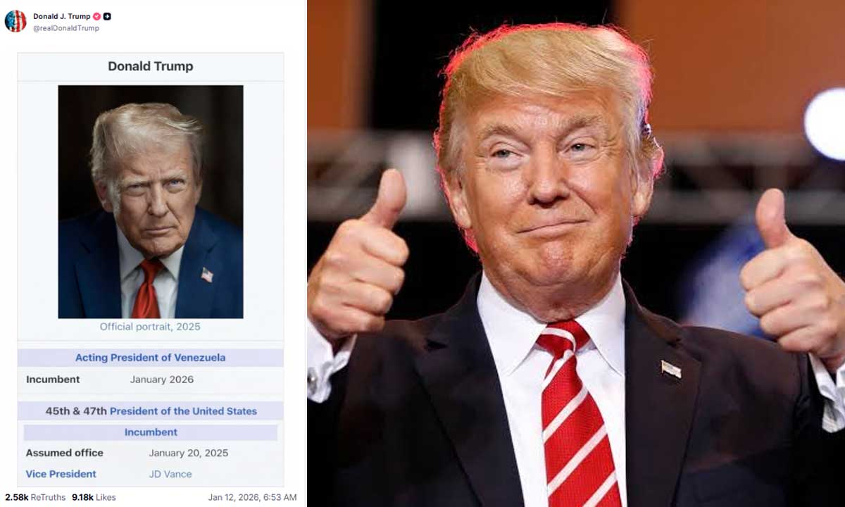 On his social media account, Trump shared a photo listing him as the “Acting President of Venezuela” as of January 2026. The image also referenced his role as the 45th and 47th President of the United States, suggesting an unusual and symbolic assertion of political authority.