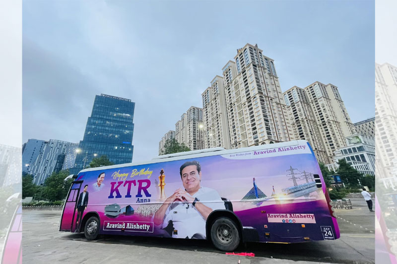 Meanwhile, BRS leaders tried to find catchy ways to wish KTR. One of them, Aravind Alishetty showcased a big bus in Hyderabad with ‘Happy birthday KTR Anna’ written on it along with KTR and KCR’s portraits.