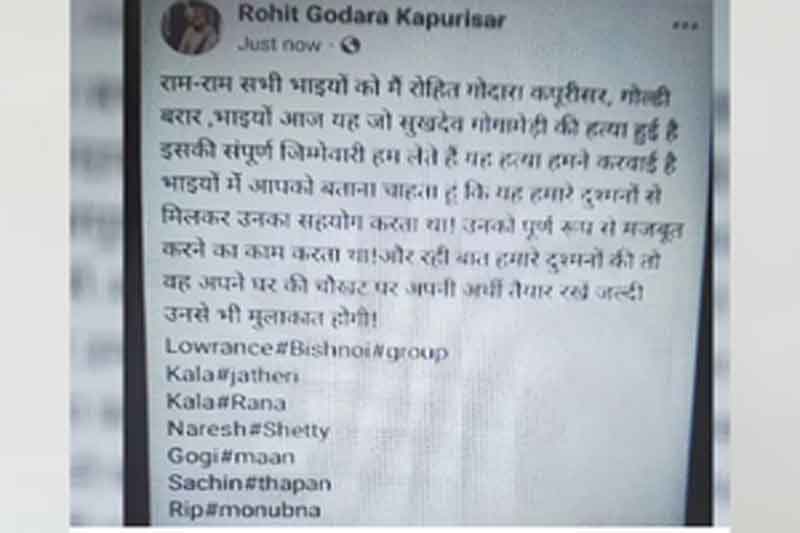 In a Facebook post in Hindi, he said: “Ram Ram to all the brothers I am Rohit Godara Kapurisar, Goldie Brar. Brothers, today Sukhdev Gogamedi was murdered. We take full responsibility for this. We have got this murder done.
